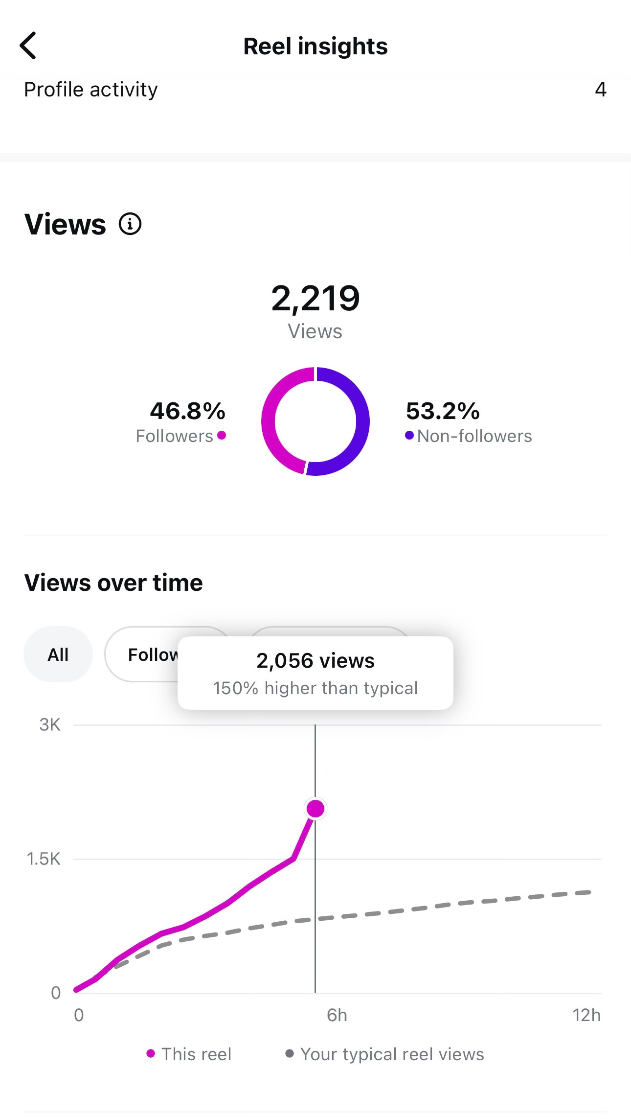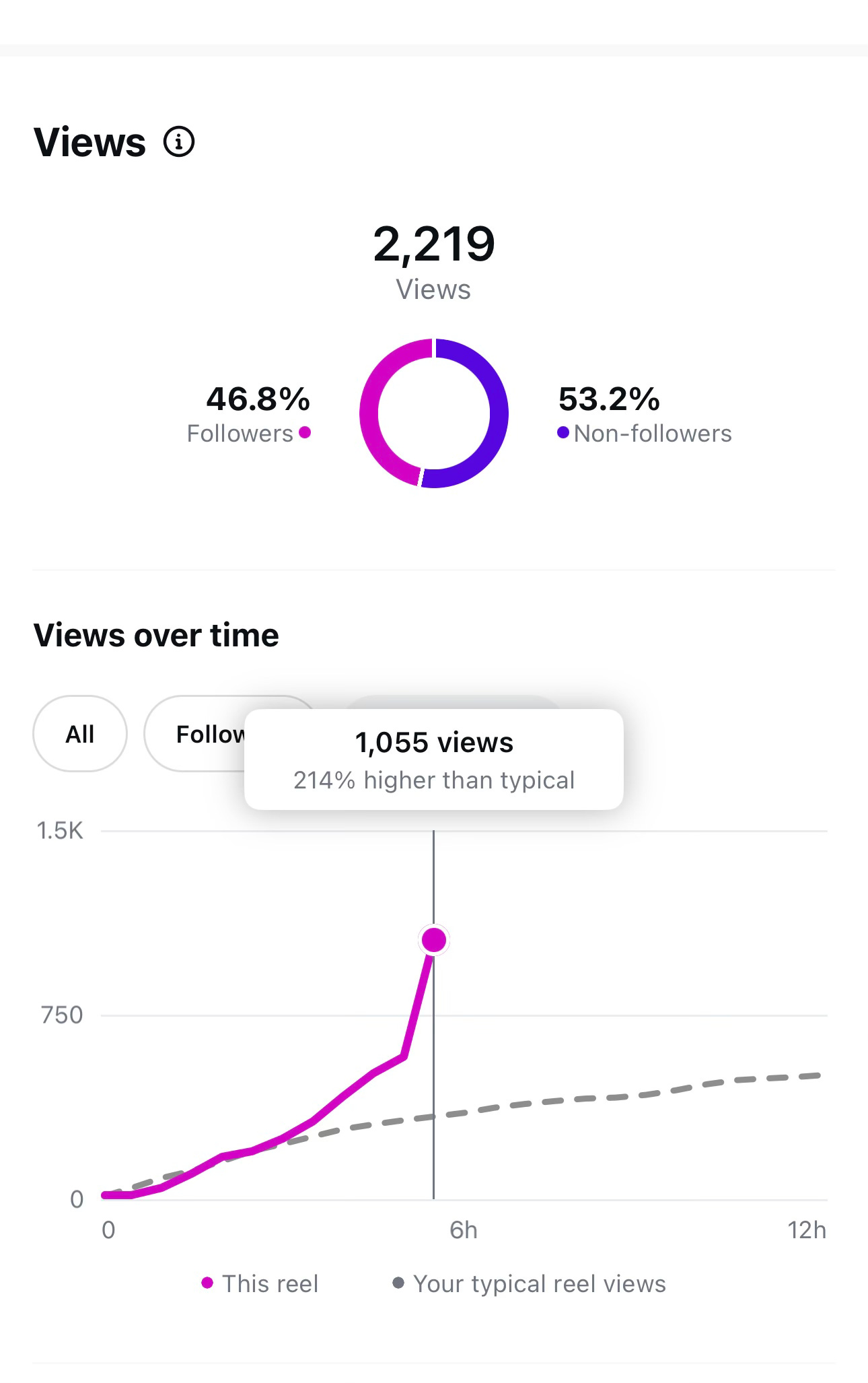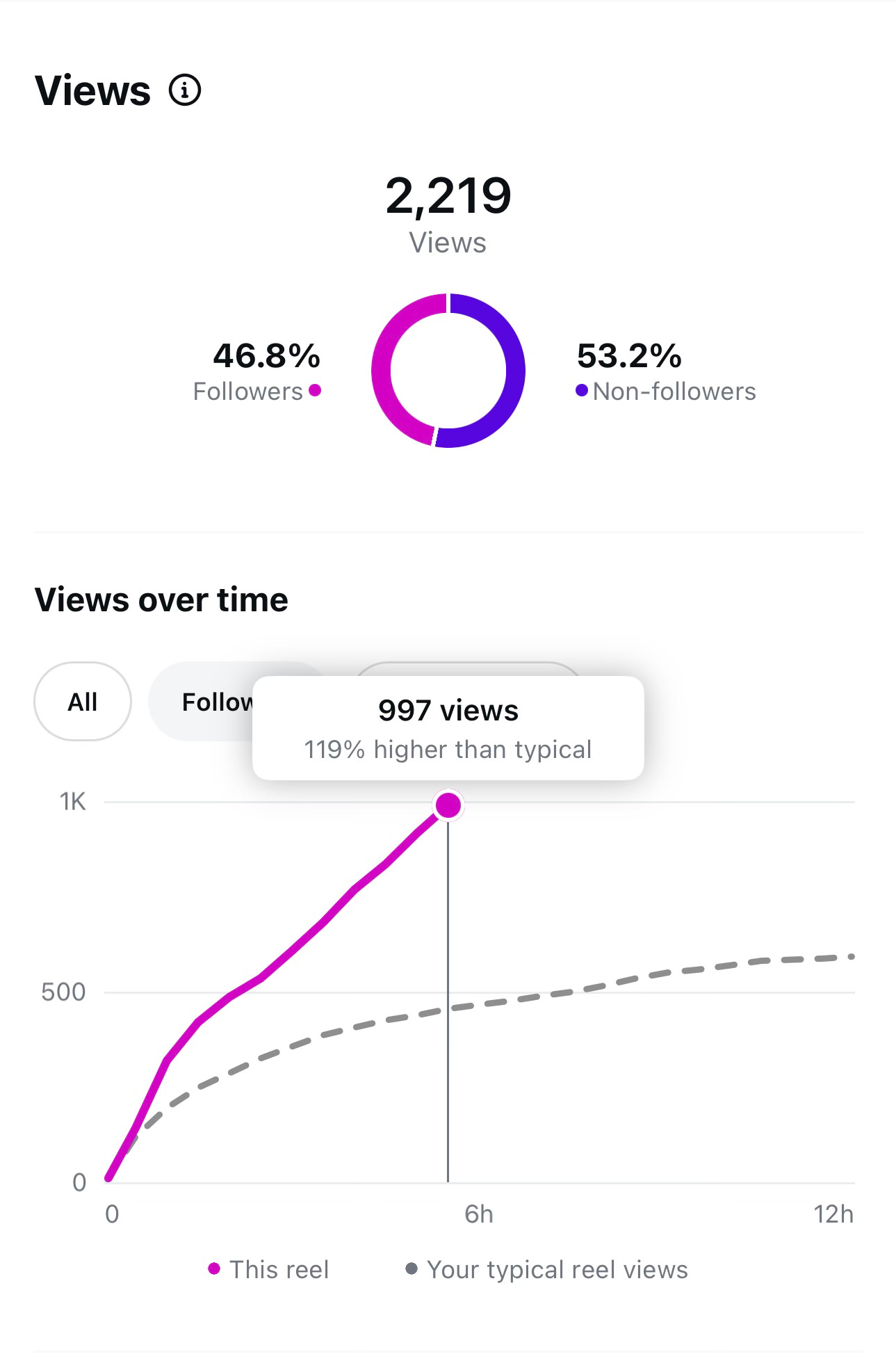 Los números son proporcionales a la cantidad de visualizaciones que regularmente recibes en tus publicaciones en las primeras horas y a la cantidad de followers de tu perfil. En este caso estábamos 150% arriba del promedio con visualizaciones provenientes tanto de followers como de non-followers.