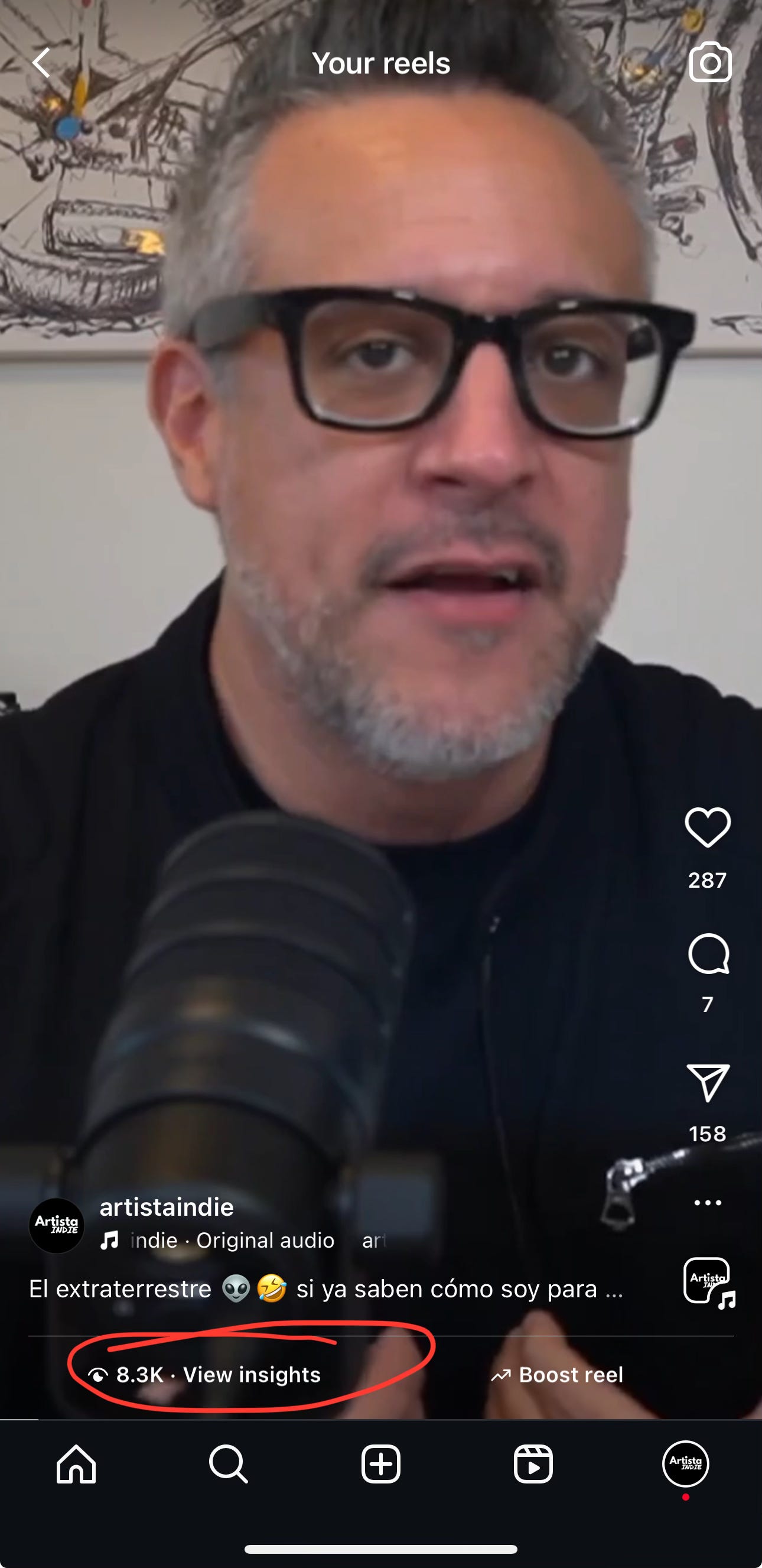 Como referencia, mi perfil de Artista Indie tiene 8,500 followers. El reel recibió de forma orgánica 8,300 views (casi el 100% en proporción a la cantidad de seguidores) 287 likes y 158 shares (55% en proporción al número de likes) y como era de esperarse la retención promedio fue muy elevada, :20 segundos para un reel de :57.